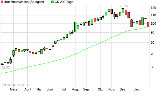 Mit dem Rücksetzer auf 94,94 EUR hat die Iron Mountain-Aktie am 28.01.2025 die 200-Tage-Linie nach unten gekreuzt.