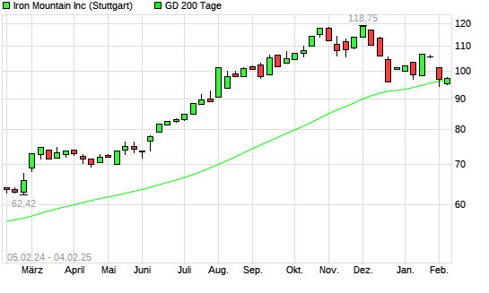 Mit dem Rücksetzer auf 95,40 EUR hat die Iron Mountain-Aktie am 03.02.2025 die 200-Tage-Linie nach unten gekreuzt.