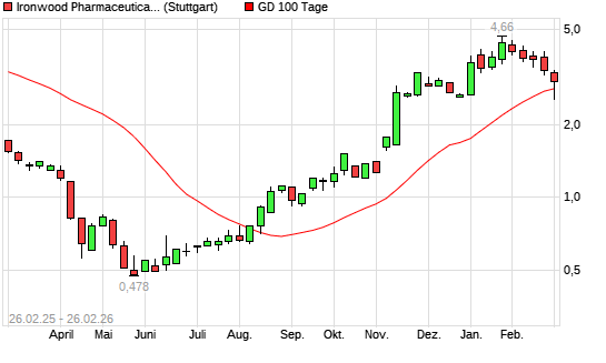 Mit dem Rücksetzer auf 2,74 EUR hat die Ironwood Pharmaceuticals-Aktie am 25.02.2026 die 100-Tage-Linie nach unten gekreuzt.