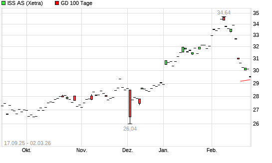 Mit dem Rücksetzer auf 29,46 EUR hat die Iss A/S Ord Shs-Aktie am 02.03.2026 die 100-Tage-Linie nach unten gekreuzt.