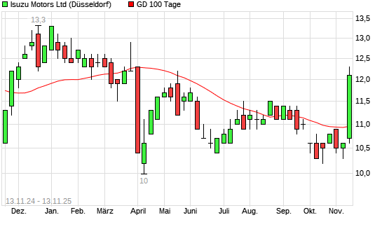 Mit dem Anstieg auf 11,20 EUR hat die Isuzu Motors-Aktie am 12.11.2025 die 100-Tage-Linie nach oben gekreuzt.