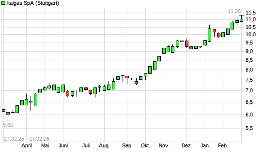 Mit dem Anstieg auf 11,10 EUR hat die Italgas SPA-Aktie (ISIN IT0005211237) am 26.02.2026 ein neues All-Time-High erreicht und damit den Kurs vom 25.02.2026 eingestellt.