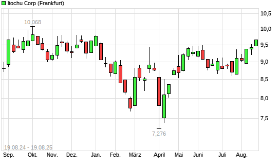 Mit dem Anstieg auf 47,70 EUR hat die Itochu-Aktie (ISIN JP3143600009) am 18.08.2025 ein neues 6-Monats-Hoch erreicht und damit den Kurs vom 02.06.2025 eingestellt.