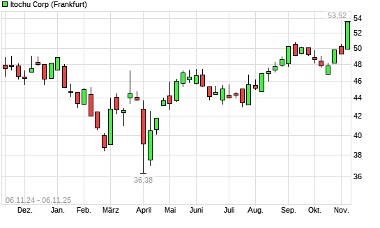 Mit dem Anstieg auf 52,32 EUR hat die Itochu-Aktie (ISIN JP3143600009) am 05.11.2025 ein neues All-Time-High erreicht und damit den Kurs vom 04.11.2025 eingestellt.