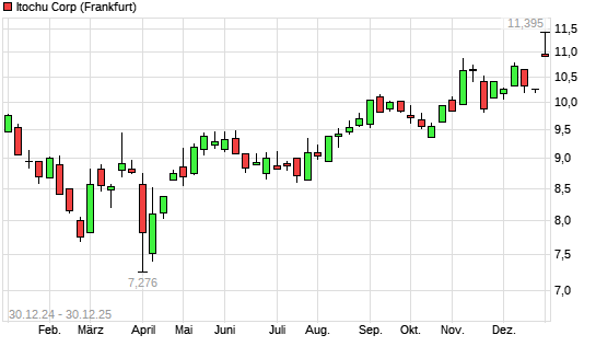 Mit dem Anstieg auf 11,19 EUR hat die Itochu-Aktie (ISIN JP3143600009) am 29.12.2025 ein neues All-Time-High erreicht und damit den Kurs vom 10.11.2025 eingestellt.