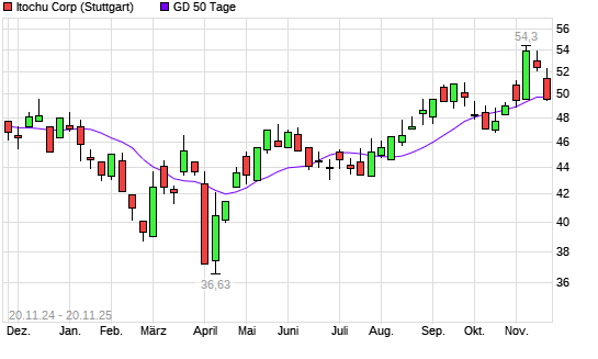 Mit dem Anstieg auf 50,58 EUR hat die Itochu-Aktie am 19.11.2025 die 50-Tage-Linie nach oben gekreuzt.