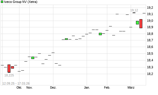 Mit dem Anstieg auf 19,09 EUR hat die Iveco Group-Aktie (ISIN NL0015000LU4) am 18.03.2026 ein neues 6-Monats-Hoch erreicht und damit den Kurs vom 25.02.2026 eingestellt.
