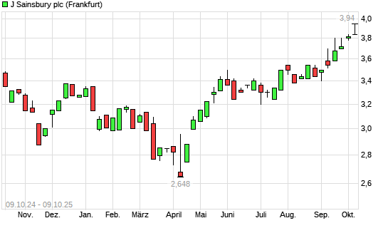 Mit dem Anstieg auf 3,94 EUR hat die J Sainsbury-Aktie (ISIN GB00B019KW72) am 08.10.2025 ein neues 10-Jahres-Hoch erreicht und damit den Kurs vom 06.11.2015 eingestellt.