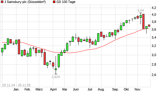Mit dem Anstieg auf 3,70 EUR hat die J Sainsbury-Aktie am 24.11.2025 die 100-Tage-Linie nach oben gekreuzt.