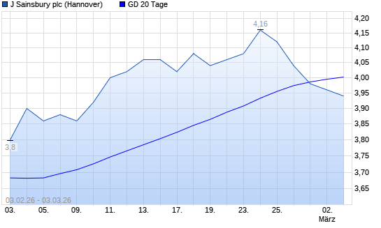 Mit dem Rücksetzer auf 3,88 EUR hat die J Sainsbury-Aktie am 02.03.2026 die 20-Tage-Linie nach unten gekreuzt.