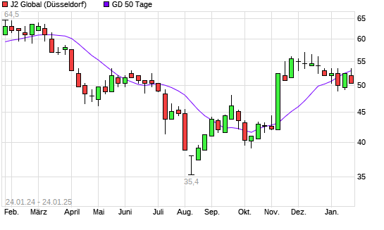 Mit dem Rücksetzer auf 51,00 EUR hat die J2 GLOBAL-Aktie am 23.01.2025 die 50-Tage-Linie nach unten gekreuzt.