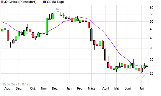 Mit dem Rücksetzer auf 27,60 EUR hat die J2 GLOBAL-Aktie am 14.07.2025 die 50-Tage-Linie nach unten gekreuzt.