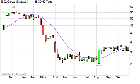 Mit dem Rücksetzer auf 30,80 EUR hat die J2 GLOBAL-Aktie am 27.10.2025 die 50-Tage-Linie nach unten gekreuzt.