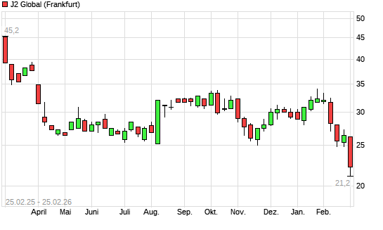 Mit dem Rücksetzer auf 22,20 EUR hat die J2 GLOBAL-Aktie (ISIN US48123V1026) am 24.02.2026 ein neues 10-Jahres-Tief erreicht und damit den Kurs vom 23.02.2026 eingestellt.Die ...weiterlesen