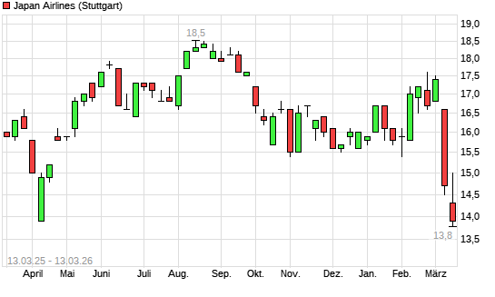 Mit dem Rücksetzer auf 14,30 EUR hat die JAPAN AIRLINES CO.-Aktie (ISIN JP3705200008) am 12.03.2026 ein neues 6-Monats-Tief erreicht und damit den Kurs vom 11.03.2026 eingestellt.
