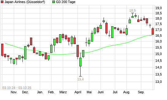 Mit dem Rücksetzer auf 16,50 EUR hat die JAPAN AIRLINES CO.-Aktie am 02.10.2025 die 200-Tage-Linie nach unten gekreuzt.
