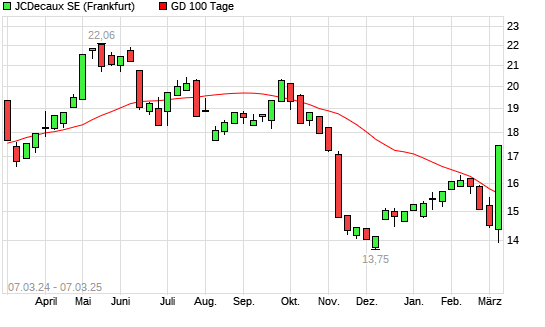 Mit dem Anstieg auf 16,39 EUR hat die JCDecaux-Aktie am 06.03.2025 die 100-Tage-Linie nach oben gekreuzt.