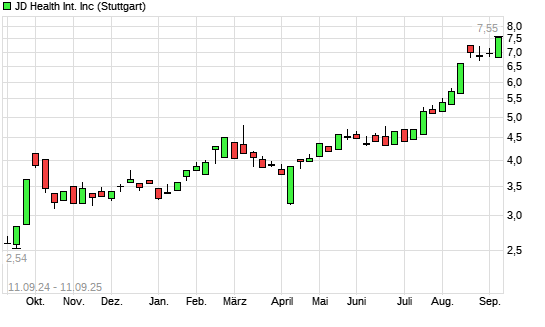 Mit dem Anstieg auf 7,35 EUR hat die JD Health-Aktie (ISIN KYG5074A1004) am 10.09.2025 ein neues 12-Monats-Hoch erreicht und damit den Kurs vom 26.08.2025 eingestellt.