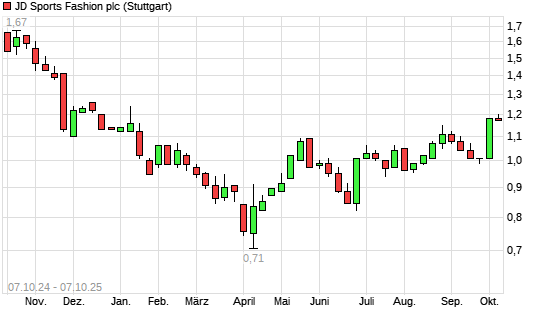 Mit dem Anstieg auf 1,24 EUR hat die JD Sports Fashion-Aktie (ISIN GB00BM8Q5M07) am 06.10.2025 ein neues 6-Monats-Hoch erreicht und damit den Kurs vom 03.10.2025 eingestellt.