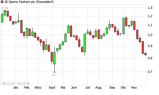 Mit dem Rücksetzer auf 0,81 EUR hat die JD Sports Fashion-Aktie (ISIN GB00BM8Q5M07) am 24.11.2025 ein neues 6-Monats-Tief erreicht und damit den Kurs vom 24.06.2025 eingestellt.
