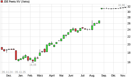 Mit dem Anstieg auf 31,66 EUR hat die JDE Peets-Aktie (ISIN NL0014332678) am 04.11.2025 ein neues 3-Jahres-Hoch erreicht und damit den Kurs vom 10.09.2025 eingestellt.