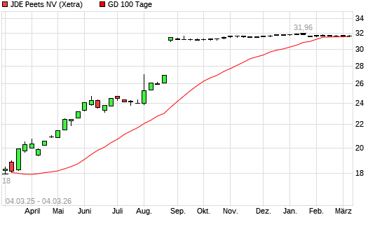 Mit dem Rücksetzer auf 31,52 EUR hat die JDE Peets-Aktie am 03.03.2026 die 100-Tage-Linie nach unten gekreuzt.