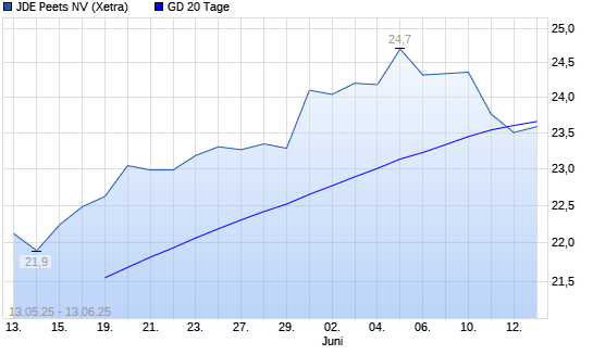 Mit dem Rücksetzer auf 23,50 EUR hat die JDE Peets-Aktie am 12.06.2025 die 20-Tage-Linie nach unten gekreuzt.