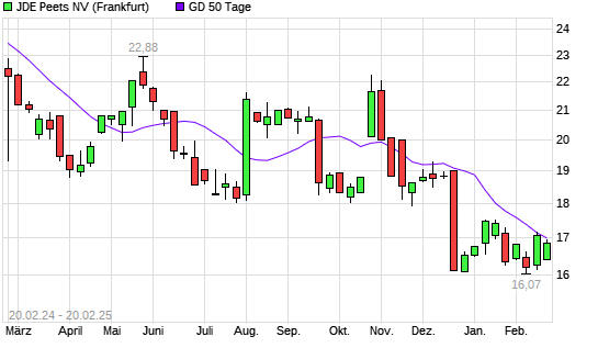 Mit dem Anstieg auf 17,00 EUR hat die JDE Peets-Aktie am 19.02.2025 die 50-Tage-Linie nach oben gekreuzt.Die JDE Peets-Aktie befindet sich seit dem 01.11.2024 im langfristigen Abwärtstrend und ...weiterlesen