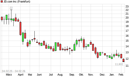 Mit dem Rücksetzer auf 11,80 EUR hat die JD.com A-Aktie (ISIN KYG8208B1014) am 03.02.2026 ein neues 12-Monats-Tief erreicht und damit den Kurs vom 02.02.2026 eingestellt.