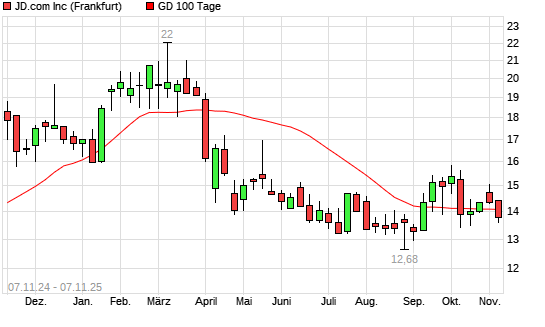 Mit dem Anstieg auf 14,03 EUR hat die JD.com A-Aktie am 06.11.2025 die 100-Tage-Linie nach oben gekreuzt.