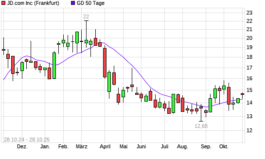 Mit dem Anstieg auf 14,70 EUR hat die JD.com A-Aktie am 27.10.2025 die 50-Tage-Linie nach oben gekreuzt.