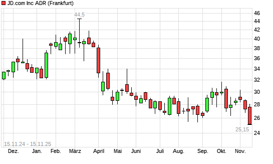 Mit dem Rücksetzer auf 25,15 EUR hat die JD.com-Aktie (ISIN US47215P1066) am 14.11.2025 ein neues 12-Monats-Tief erreicht und damit den Kurs vom 28.08.2025 eingestellt.
