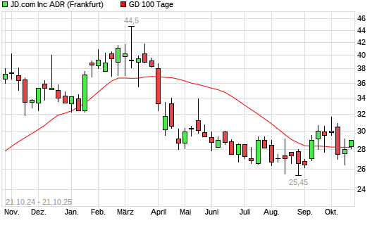 Mit dem Anstieg auf 28,95 EUR hat die JD.com-Aktie am 20.10.2025 die 100-Tage-Linie nach oben gekreuzt.