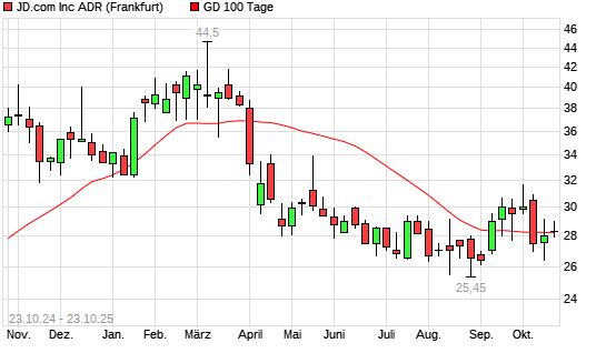Mit dem Rücksetzer auf 28,05 EUR hat die JD.com-Aktie am 22.10.2025 die 100-Tage-Linie nach unten gekreuzt.