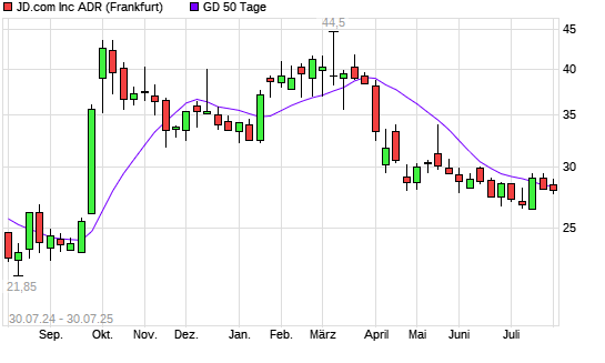Mit dem Rücksetzer auf 28,15 EUR hat die JD.com-Aktie am 29.07.2025 die 50-Tage-Linie nach unten gekreuzt.
