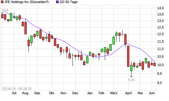 Mit dem Anstieg auf 10,30 EUR hat die JFE Holdings-Aktie am 04.06.2025 die 50-Tage-Linie nach oben gekreuzt.