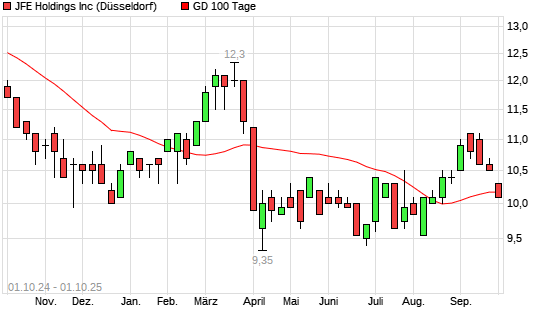 Mit dem Rücksetzer auf 10,20 EUR hat die JFE Holdings-Aktie am 30.09.2025 die 100-Tage-Linie nach unten gekreuzt.