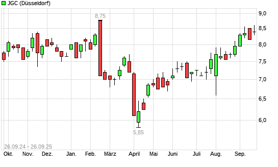 Mit dem Anstieg auf 8,55 EUR hat die JGC-Aktie (ISIN JP3667600005) am 25.09.2025 ein neues 6-Monats-Hoch erreicht und damit den Kurs vom 16.09.2025 eingestellt.