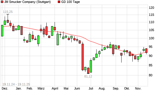 Mit dem Rücksetzer auf 90,90 EUR hat die J.M. Smucker Company-Aktie am 18.11.2025 die 100-Tage-Linie nach unten gekreuzt.