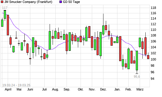 Mit dem Rücksetzer auf 101,10 EUR hat die J.M. Smucker Company-Aktie am 18.03.2025 die 50-Tage-Linie nach unten gekreuzt.