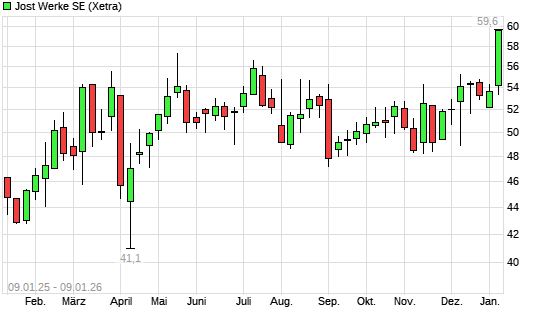 Mit dem Anstieg auf 56,40 EUR hat die JOST Werke-Aktie (ISIN DE000JST4000) am 08.01.2026 ein neues All-Time-High erreicht und damit den Kurs vom 26.01.2023 eingestellt.