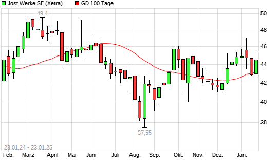 Mit dem Anstieg auf 43,20 EUR hat die JOST Werke-Aktie am 22.01.2025 die 100-Tage-Linie nach oben gekreuzt.