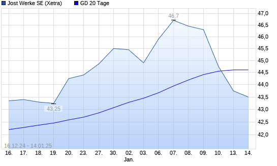 Mit dem Rücksetzer auf 44,50 EUR hat die JOST Werke-Aktie am 13.01.2025 die 20-Tage-Linie nach unten gekreuzt.