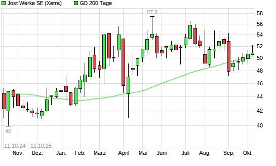 Mit dem Rücksetzer auf 50,10 EUR hat die JOST Werke-Aktie am 10.10.2025 die 200-Tage-Linie nach unten gekreuzt.