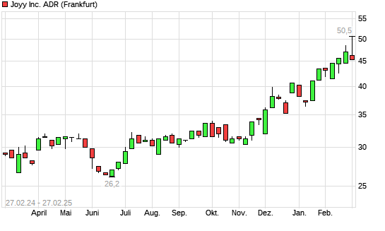 Mit dem Anstieg auf 50,50 EUR hat die JOYY-Aktie (ISIN US46591M1099) am 26.02.2025 ein neues 3-Jahres-Hoch erreicht und damit den Kurs vom 24.02.2025 eingestellt.Die JOYY-Aktie befindet sich ...weiterlesen