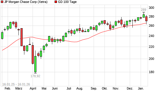 Mit dem Anstieg auf 267,60 EUR hat die JP Morgan Chase-Aktie am 15.01.2026 die 100-Tage-Linie nach oben gekreuzt.