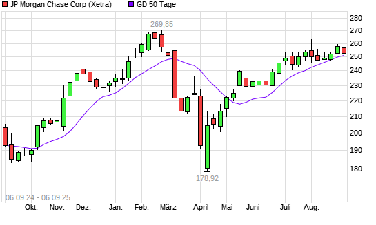 Mit dem Rücksetzer auf 251,00 EUR hat die JP Morgan Chase-Aktie am 05.09.2025 die 50-Tage-Linie nach unten gekreuzt.