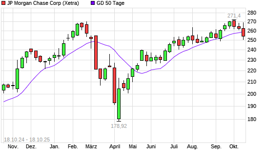Mit dem Rücksetzer auf 255,35 EUR hat die JP Morgan Chase-Aktie am 17.10.2025 die 50-Tage-Linie nach unten gekreuzt.