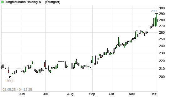 Mit dem Anstieg auf 284,50 EUR hat die JUNGFRAUBAHN HOLDING-Aktie (ISIN CH0017875789) am 03.12.2025 ein neues All-Time-High erreicht und damit den Kurs vom 26.11.2025 eingestellt.