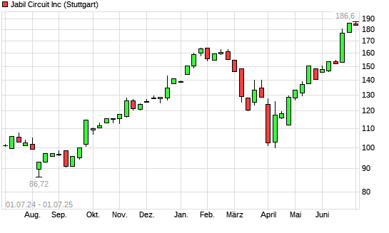 Mit dem Anstieg auf 188,00 EUR hat die Jabil Circuit-Aktie (ISIN US4663131039) am 30.06.2025 ein neues All-Time-High erreicht und damit den Kurs vom 25.06.2025 eingestellt.